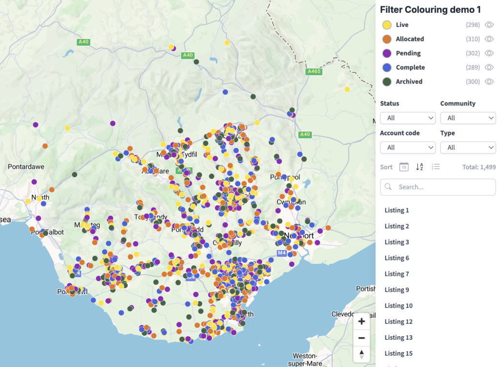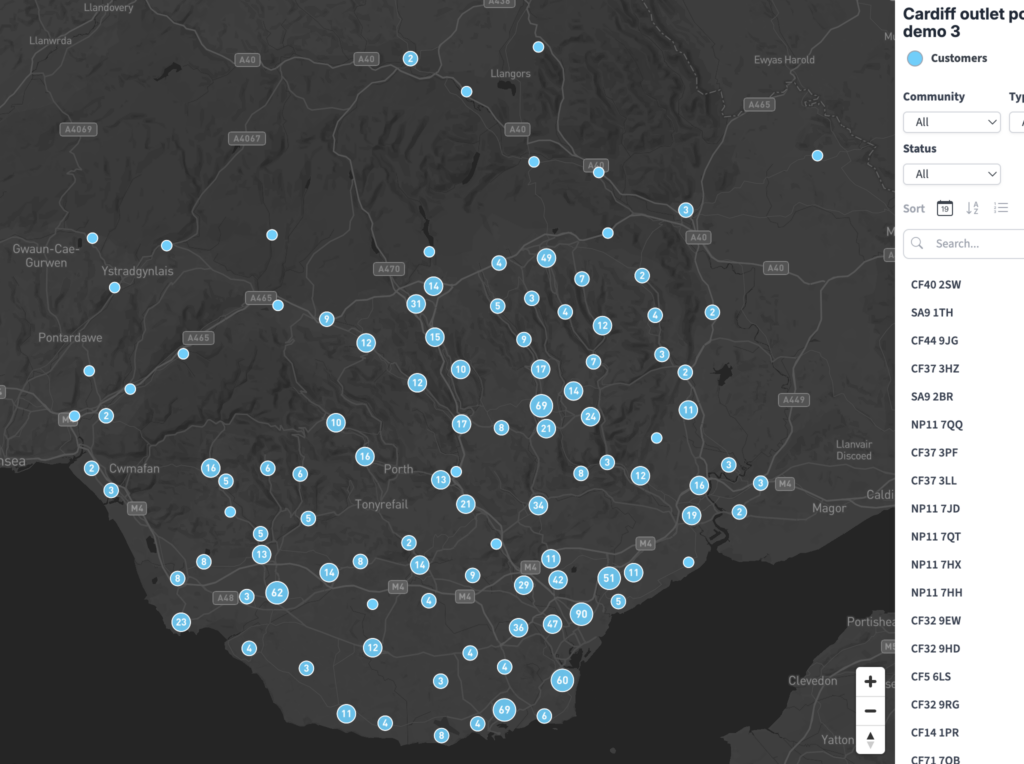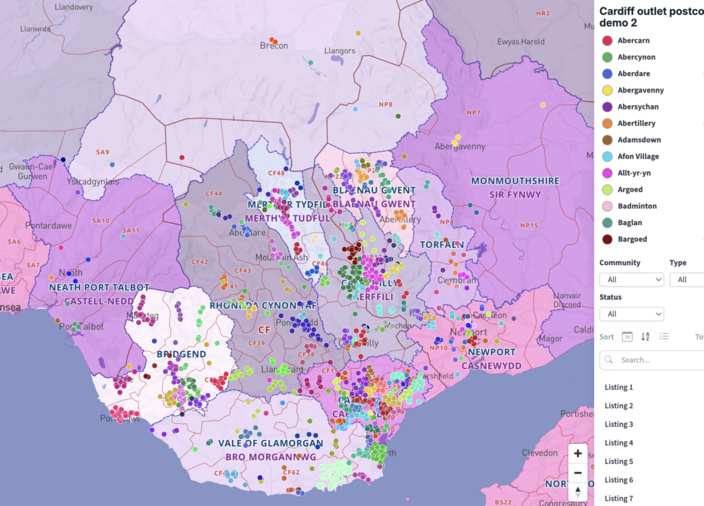 Our Bulk Postcodes tool in the Locations Plotter in the Dynamic Mapping Suite lets you plot hundreds or even thousands of postcodes in a single batch. The tool is brilliantly easy to use: simply copy your list of postcodes (one per line) into the Add a List > Postcodes box, or import a spreadsheet with postcodes and other location data, and they will be plotted within seconds as you watch. There’s a choice of backdrops including monochrome, colour, satellite, postcode boundaries, counties, local authorities, and constituencies. Every point and every listing is automatically interactive. You can also have filters and auto-colouring directly applied on import.