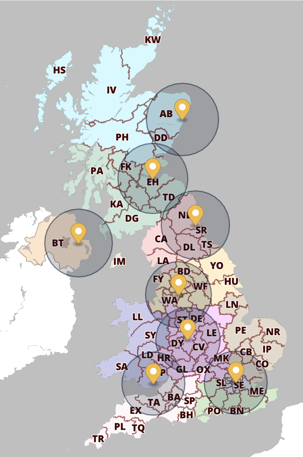 Maproom’s dynamic and interactive online postcode maps cover every geographical postcode in the UK. You can zoom deep into these maps to see postcode districts, sectors and unit centroids with the full context of roads, buildings and other geographical features. Search UK addresses and visually see postcode density in relation to local authorities, constituencies, health and police areas, and much more. These maps are invaluable for working out sales territories, marketing and mail drops, freight, fulfilment and delivery zones.